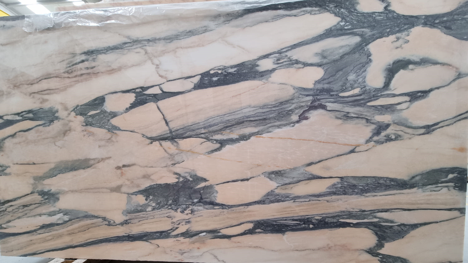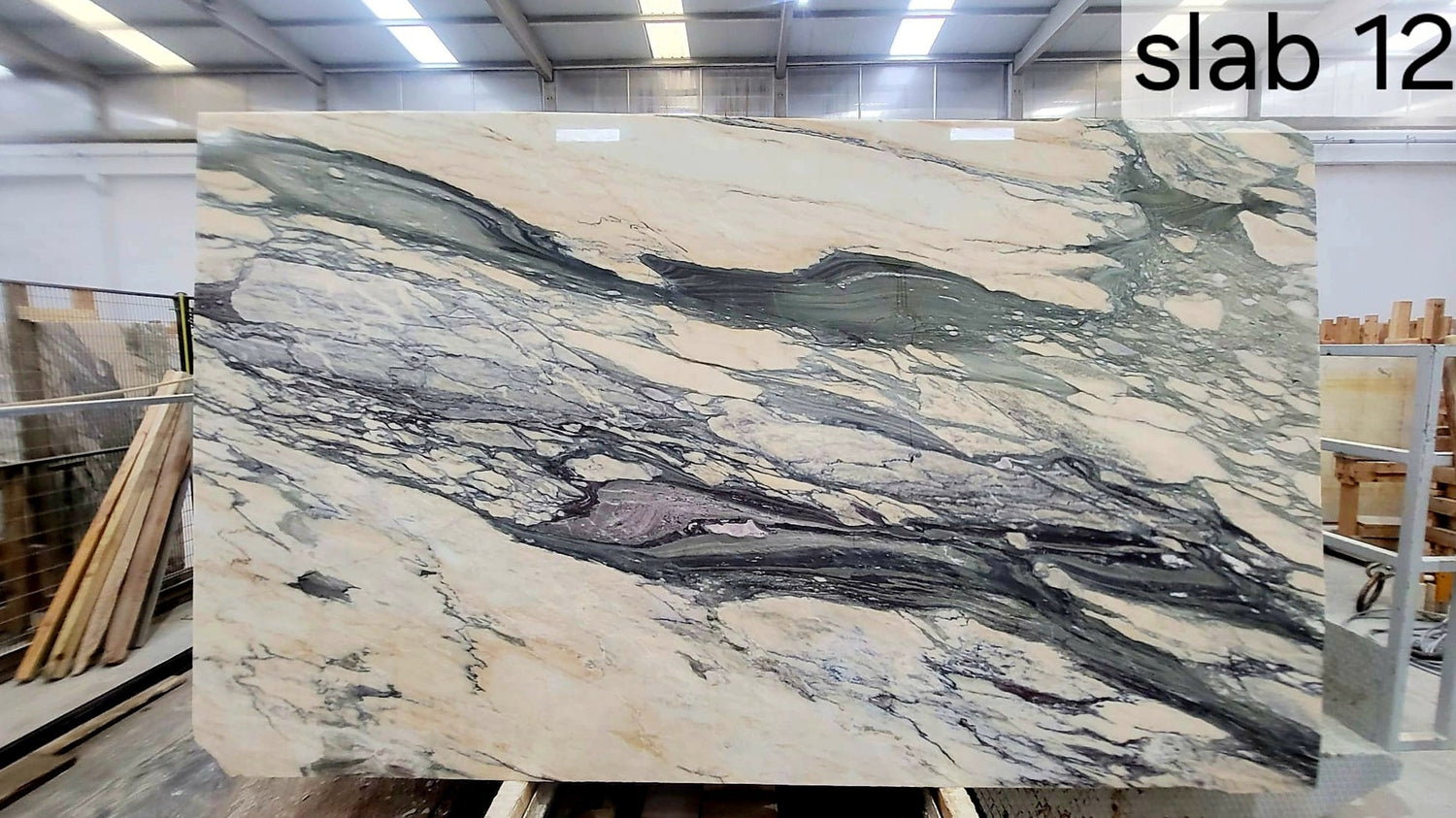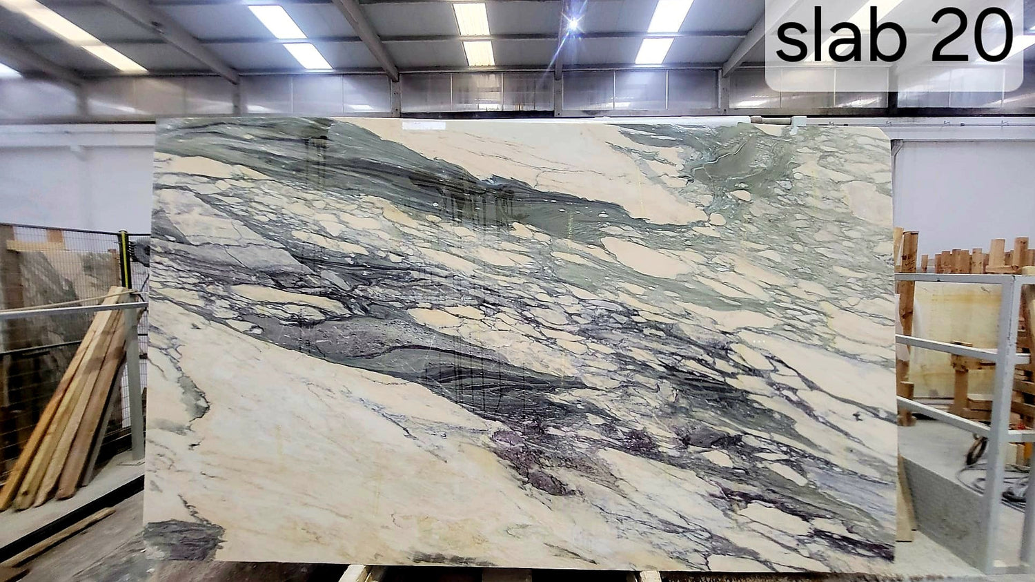 An Italian marble distinguished by its crisp white background and bold, interlacing grey , green , purple veining. The veining ranges from soft, smoky swirls to dramatic, brushstroke-like movements, giving each slab a distinctive character.