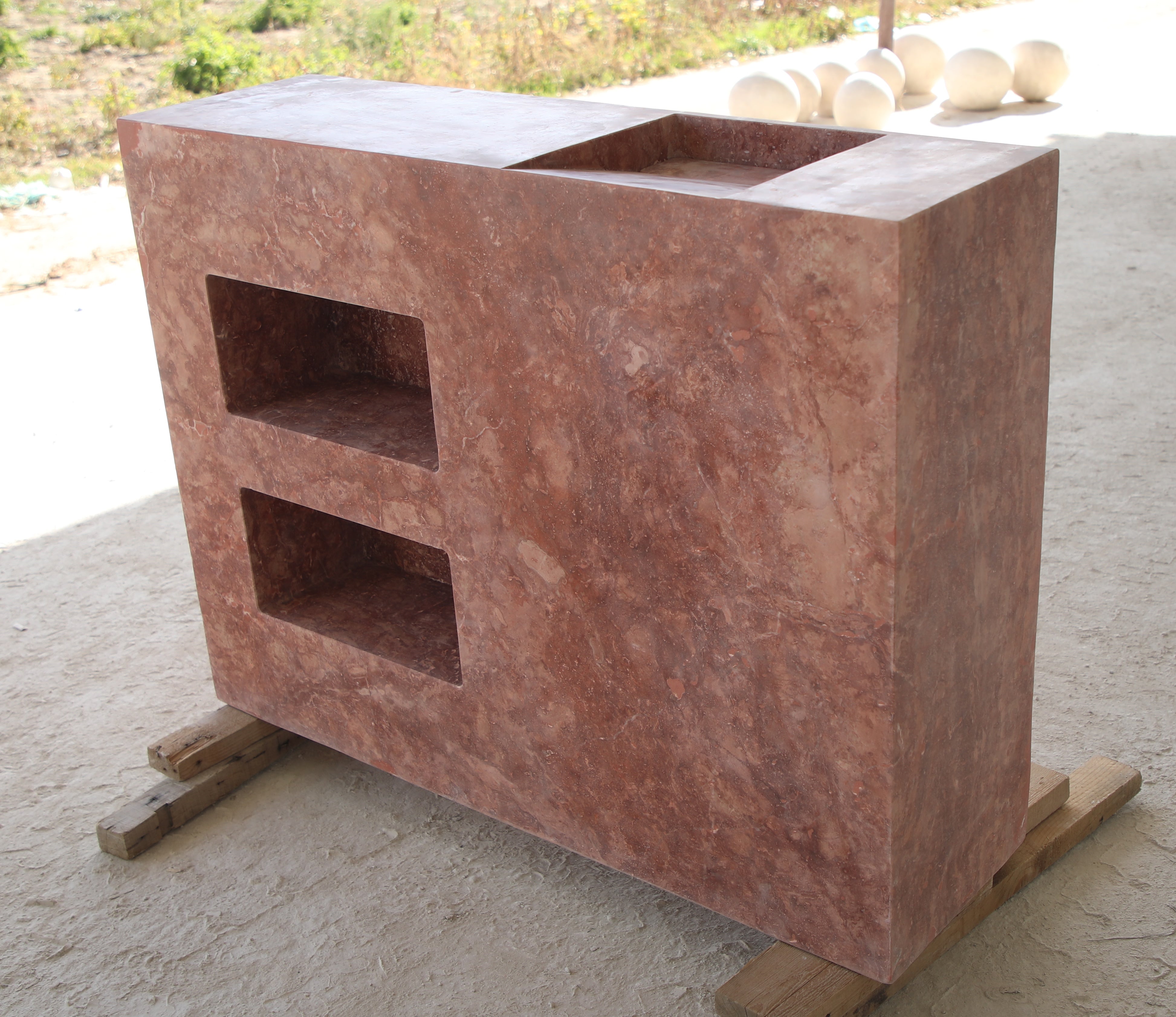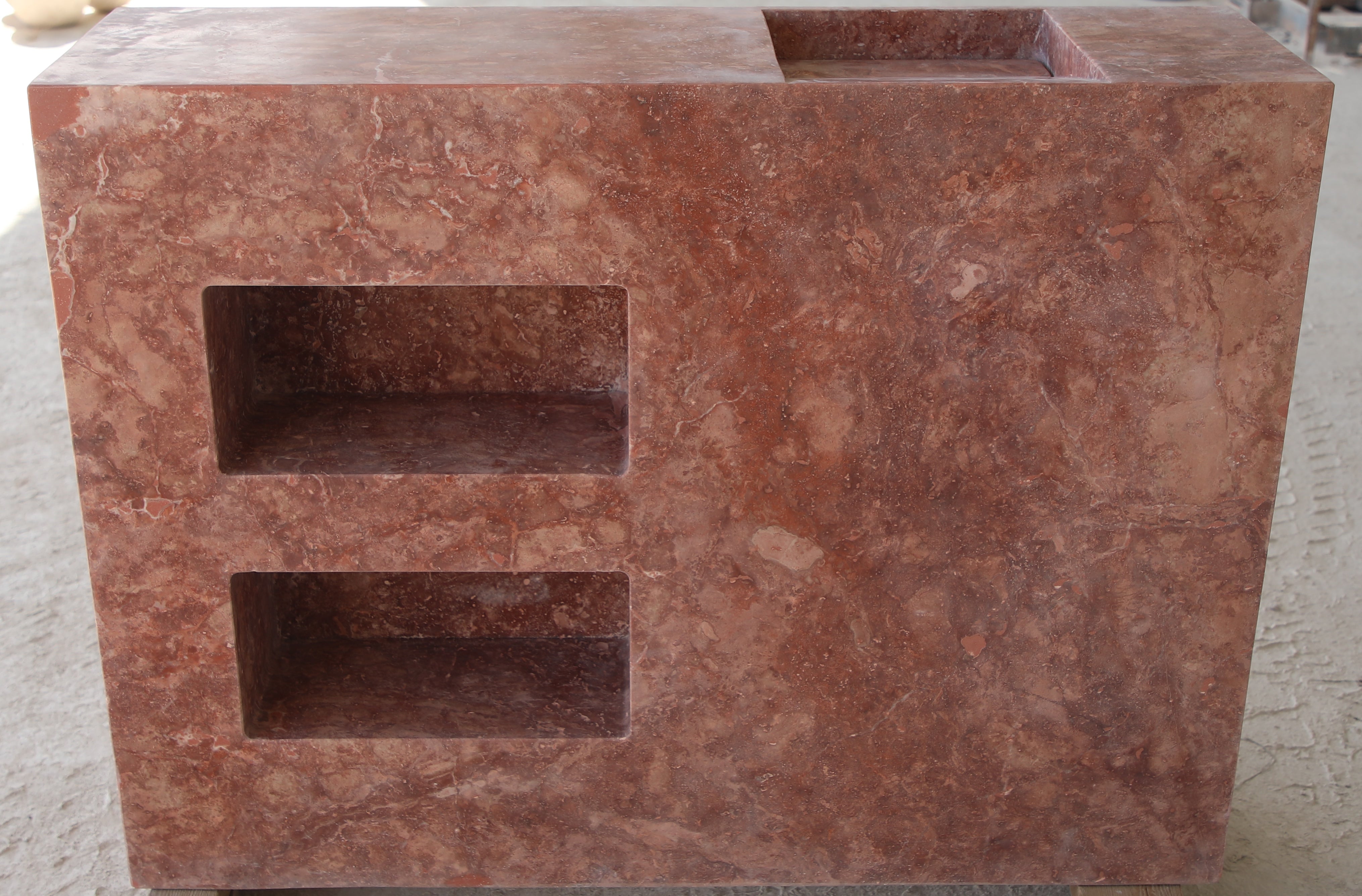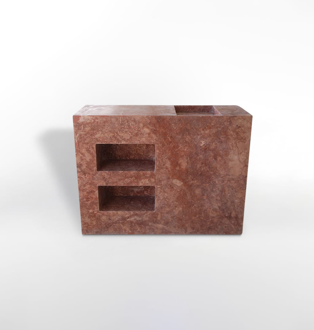 Aalto Sink with Storage is carved from a single block of stone with built in niches, embodying natural beauty and timeless design. Its minimalist form makes it a striking focal point in any bathroom or powder room.