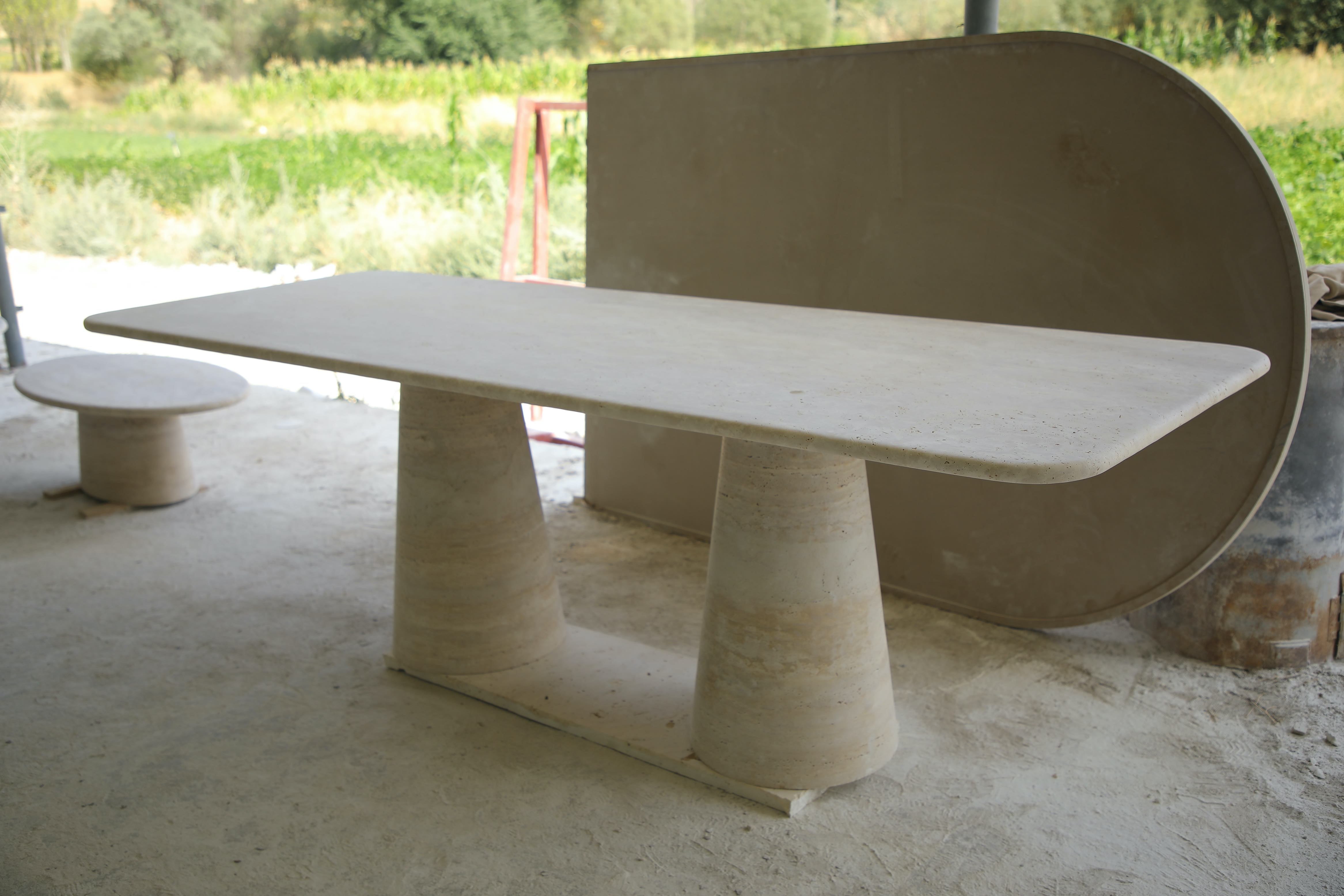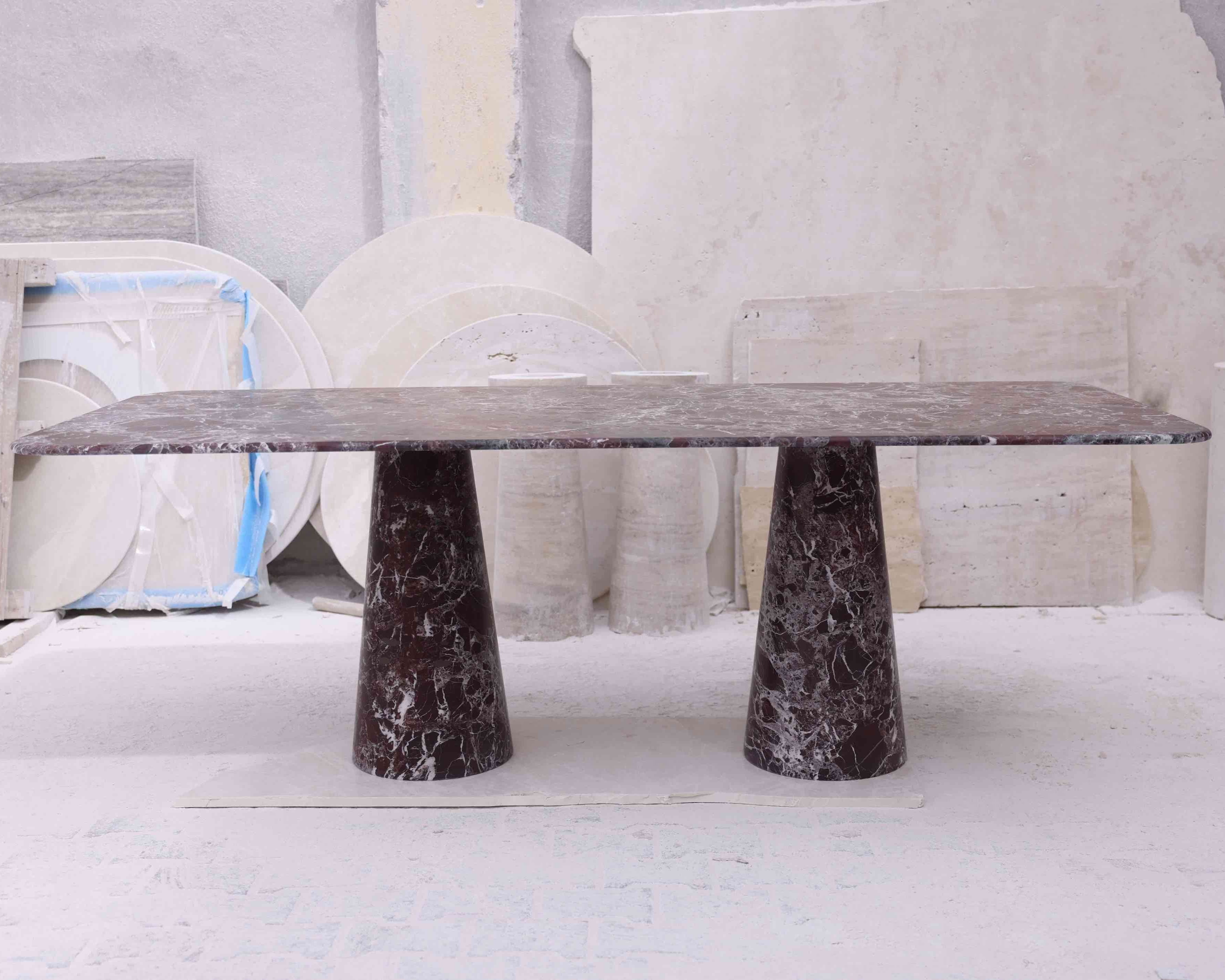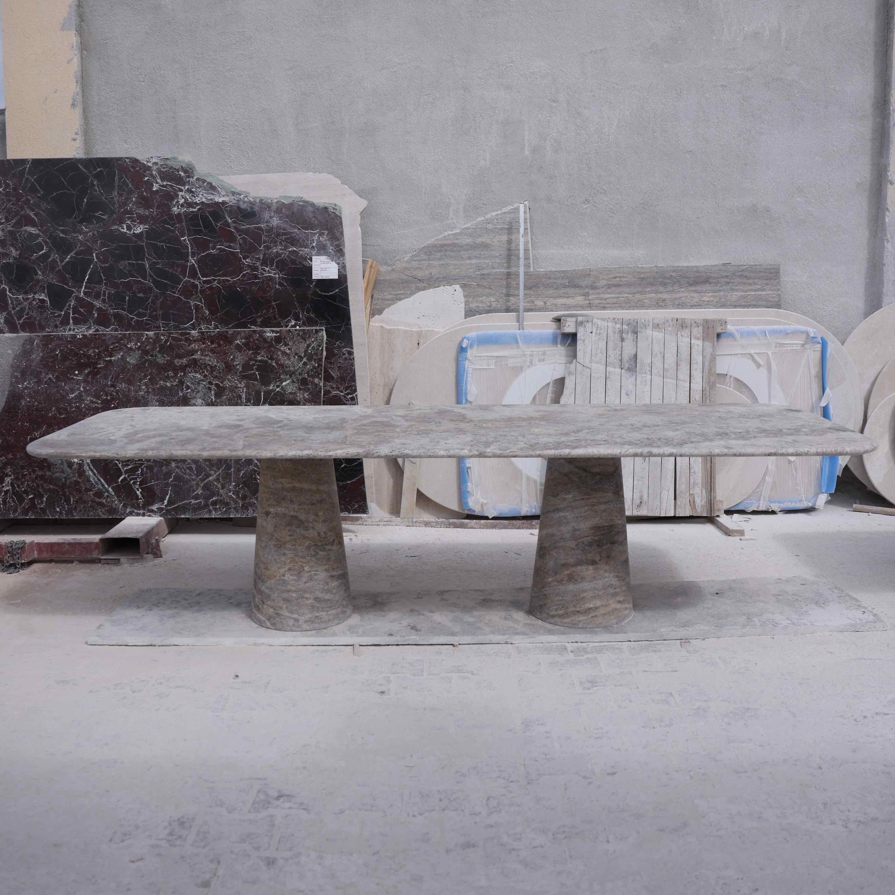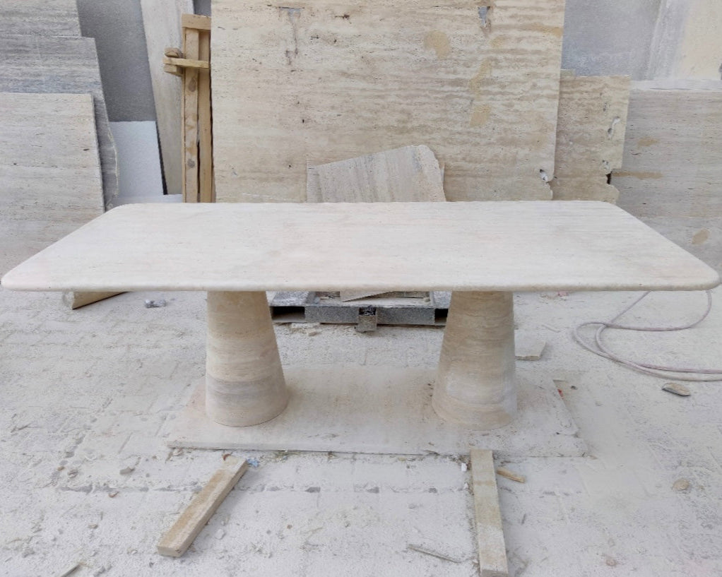 The Angelo Rectangle Dining Table features a 3 cm thick top with a soft bullnose edge, supported by two cone shape pedestal legs.