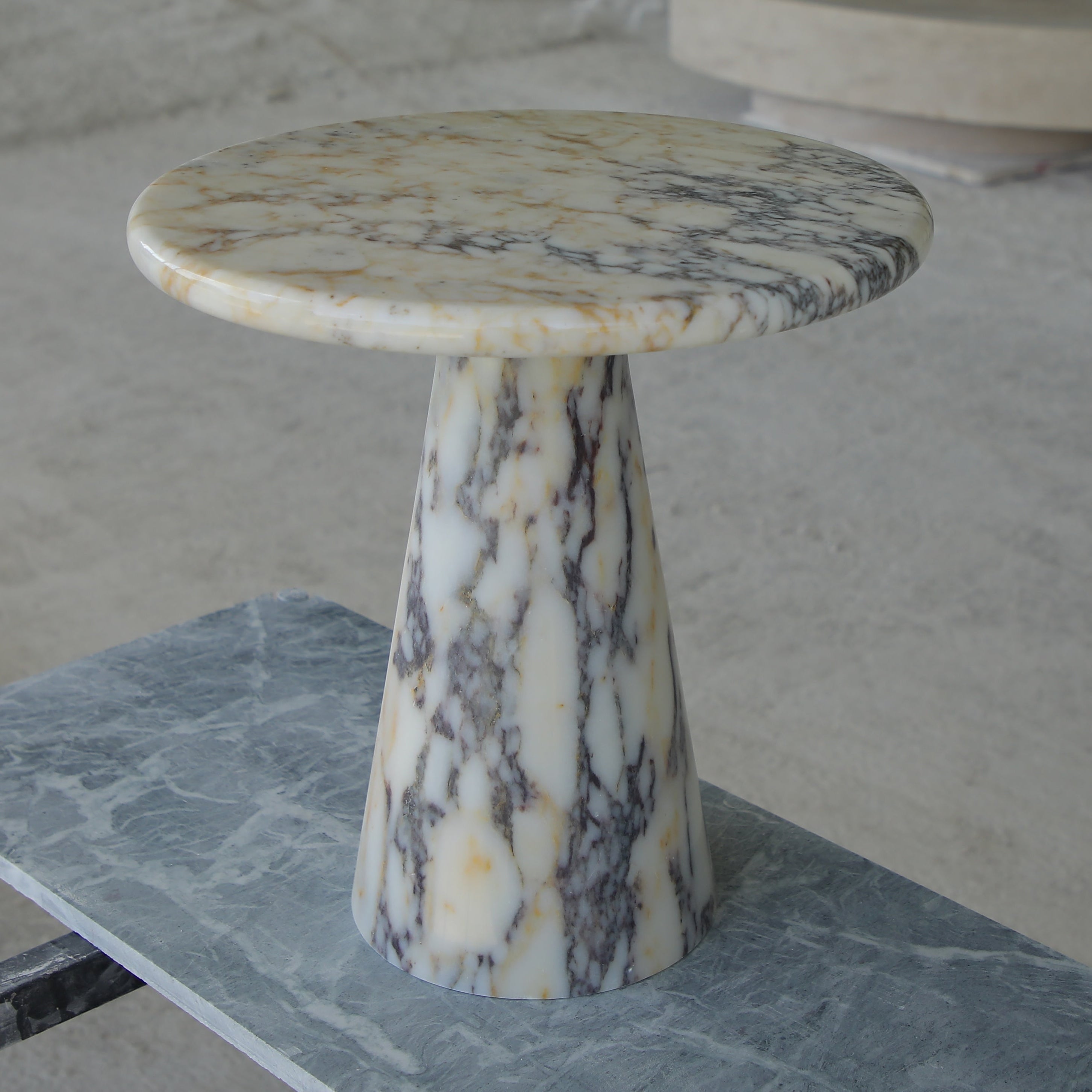 The Angelo Side Table is composed entirely of natural stone, featuring a 3 cm thick top supported by a sculpted cone-shaped base.