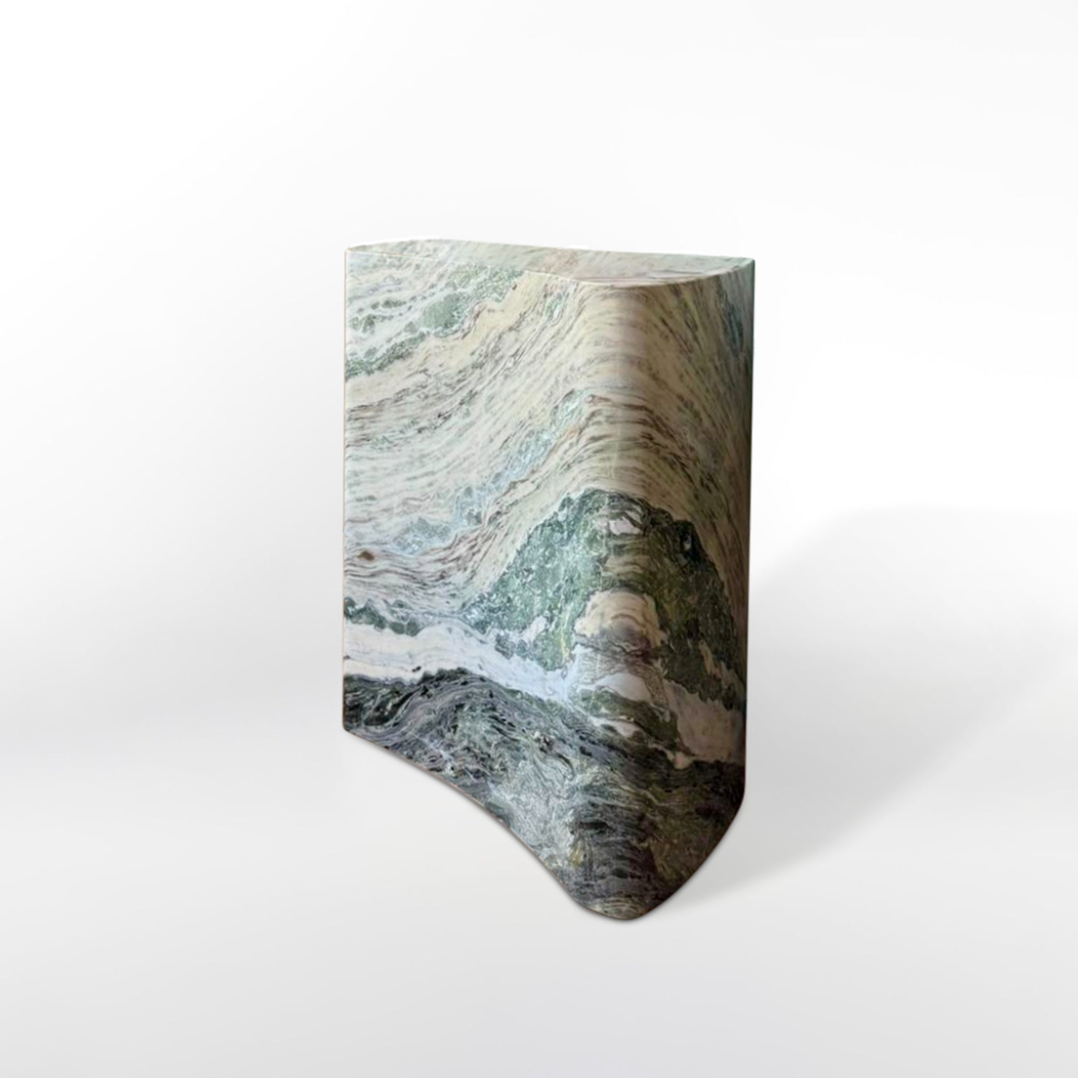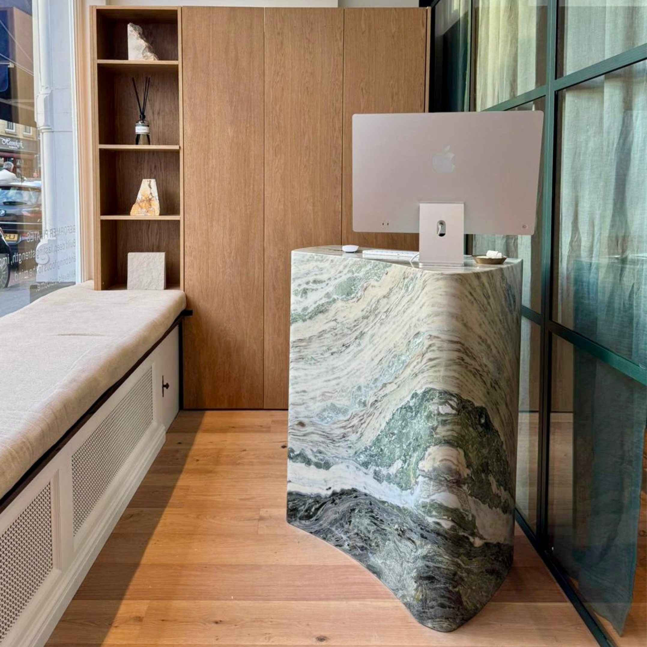 The Bondi Marble Standing Desk is a sculptural standing desk carved from a single solid block, featuring an organic, sculptural profile.