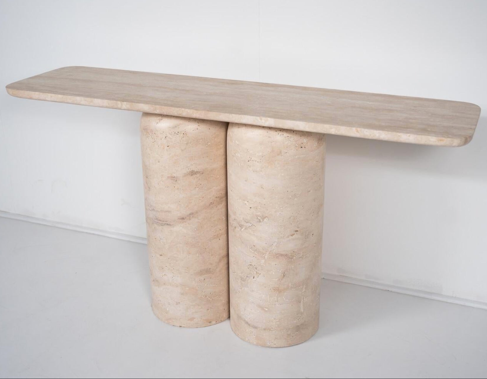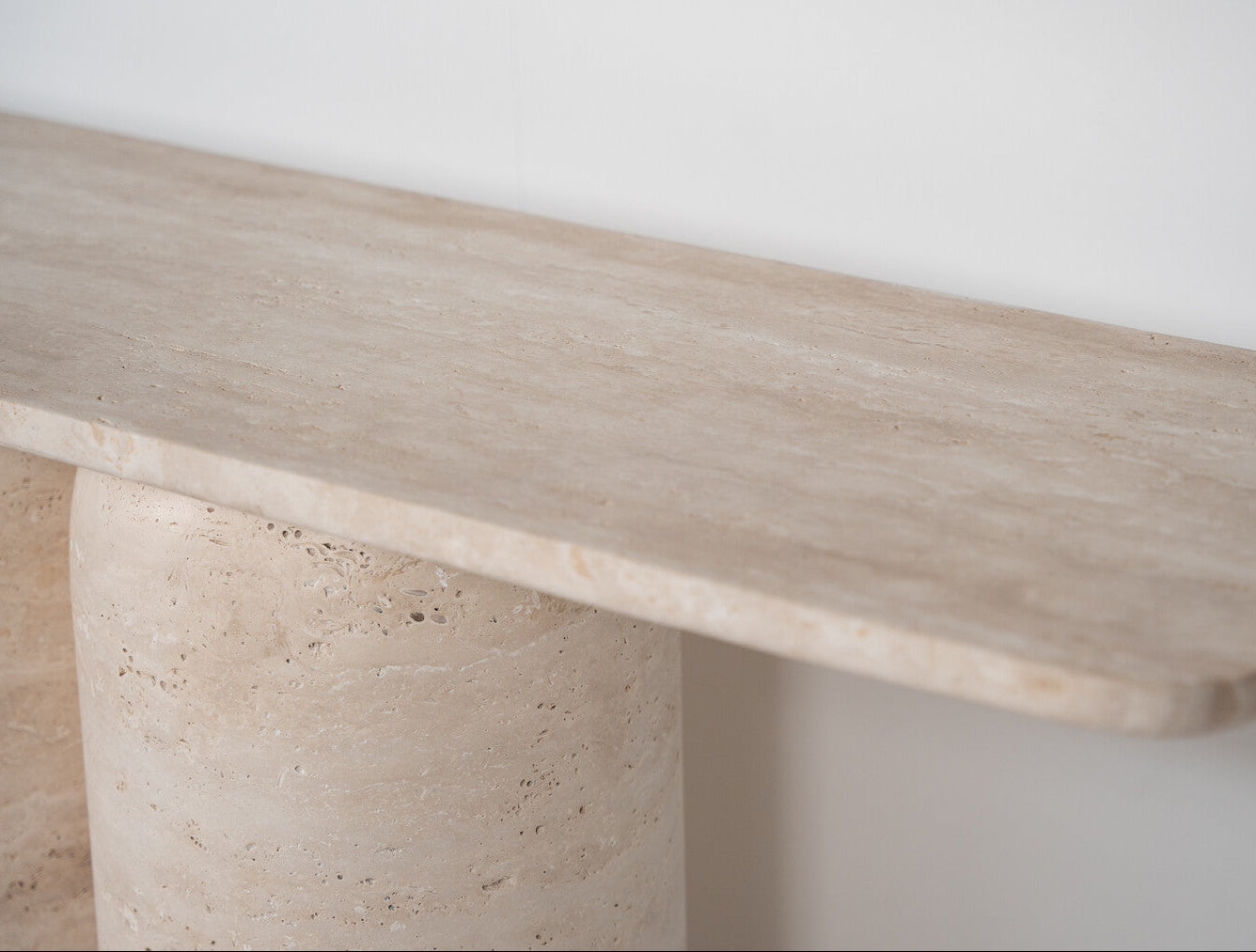 The Charlotte Console Table is crafted from solid stone, featuring a 3 cm thick top balanced on two sculptural, bullet-shaped legs. The legs can be positioned freely, allowing for a customisable arrangement that suits your space.