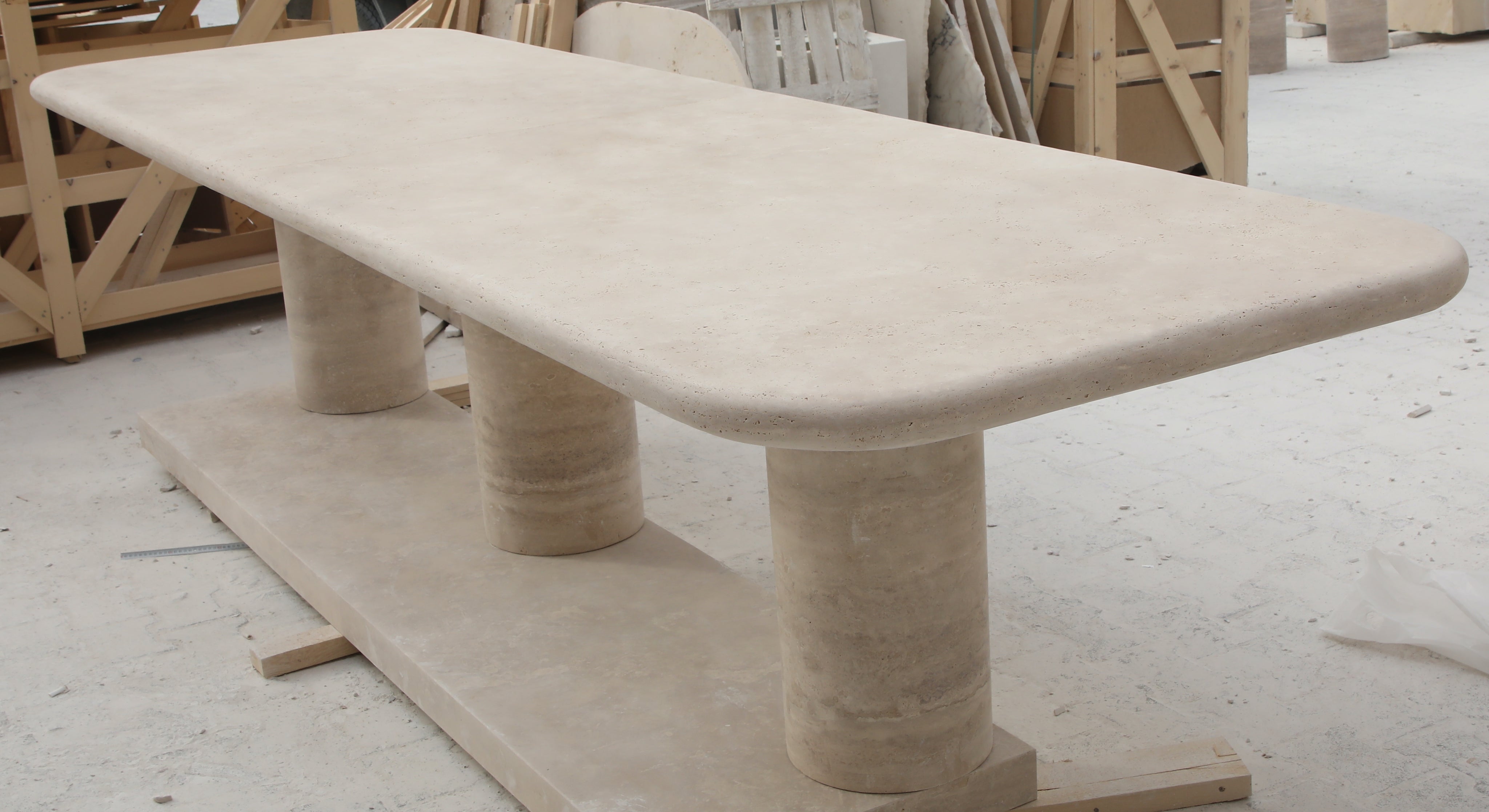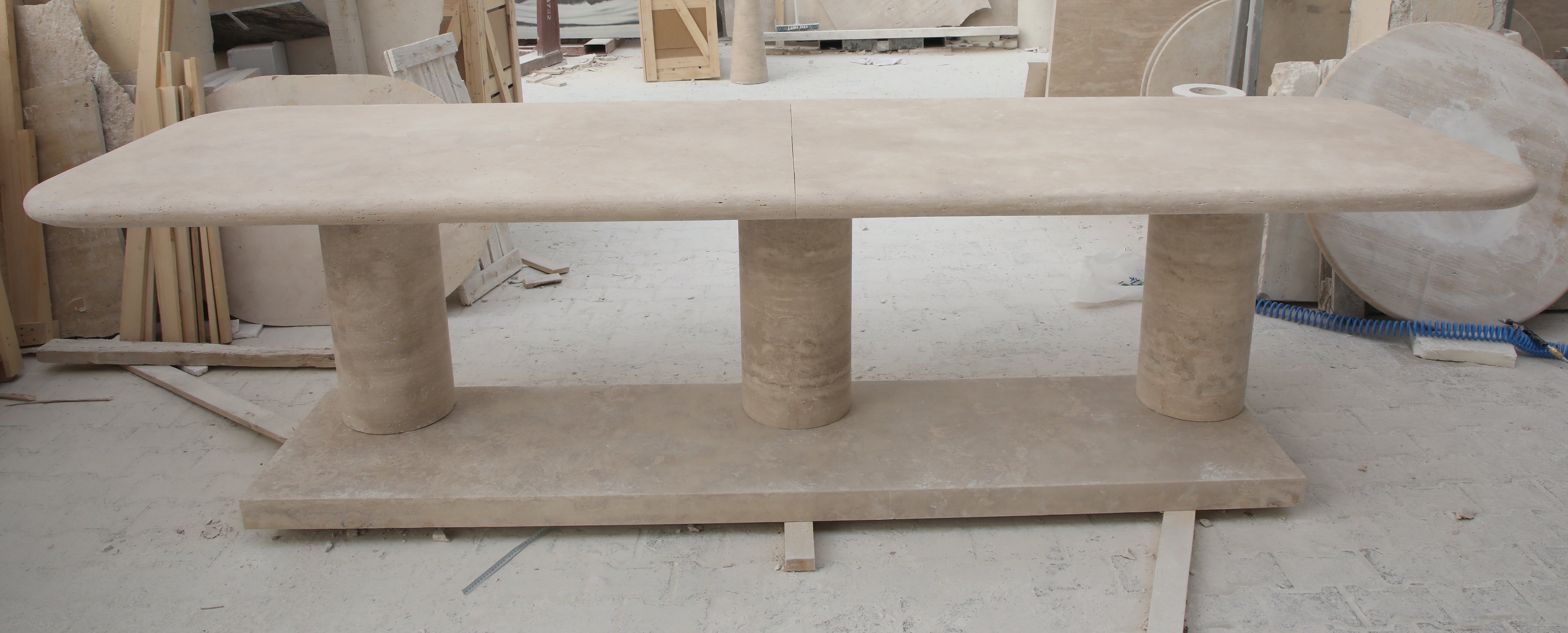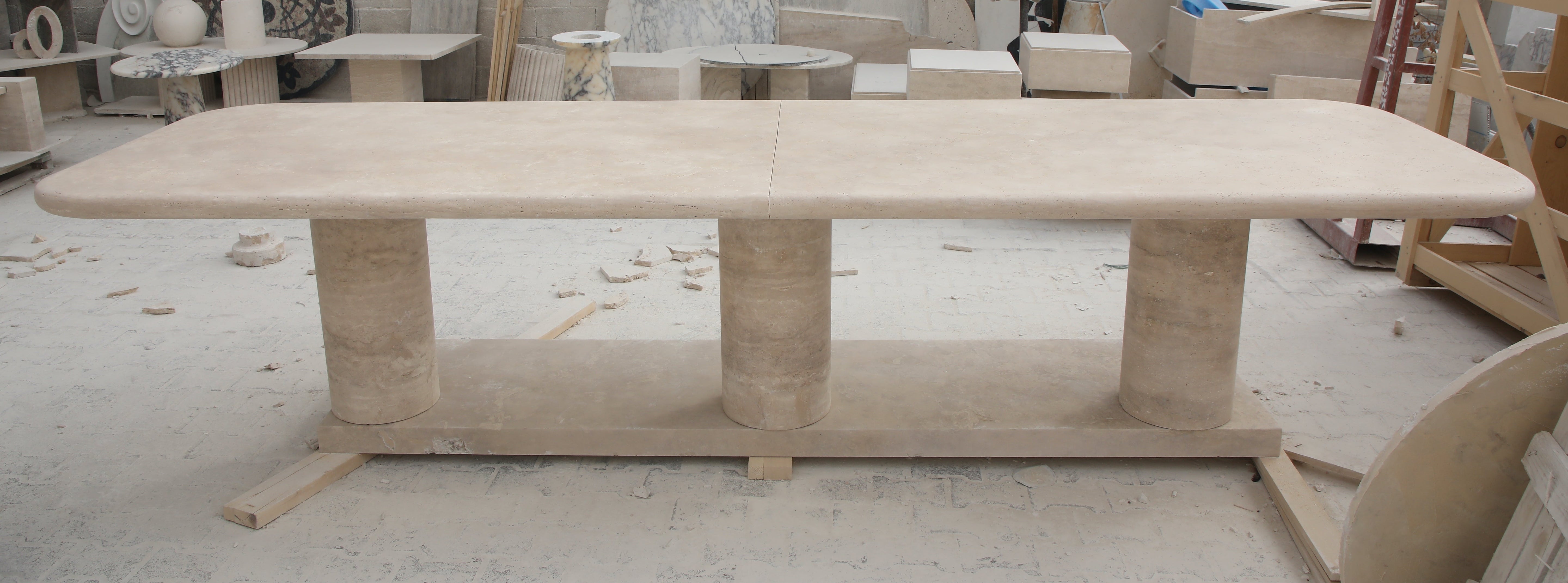 The Drift Dining Table is a functional work of art, crafted from travertine with a substantial 6 cm thick two-piece top, featuring elegantly curved edges and supported by three cylindrical columns.