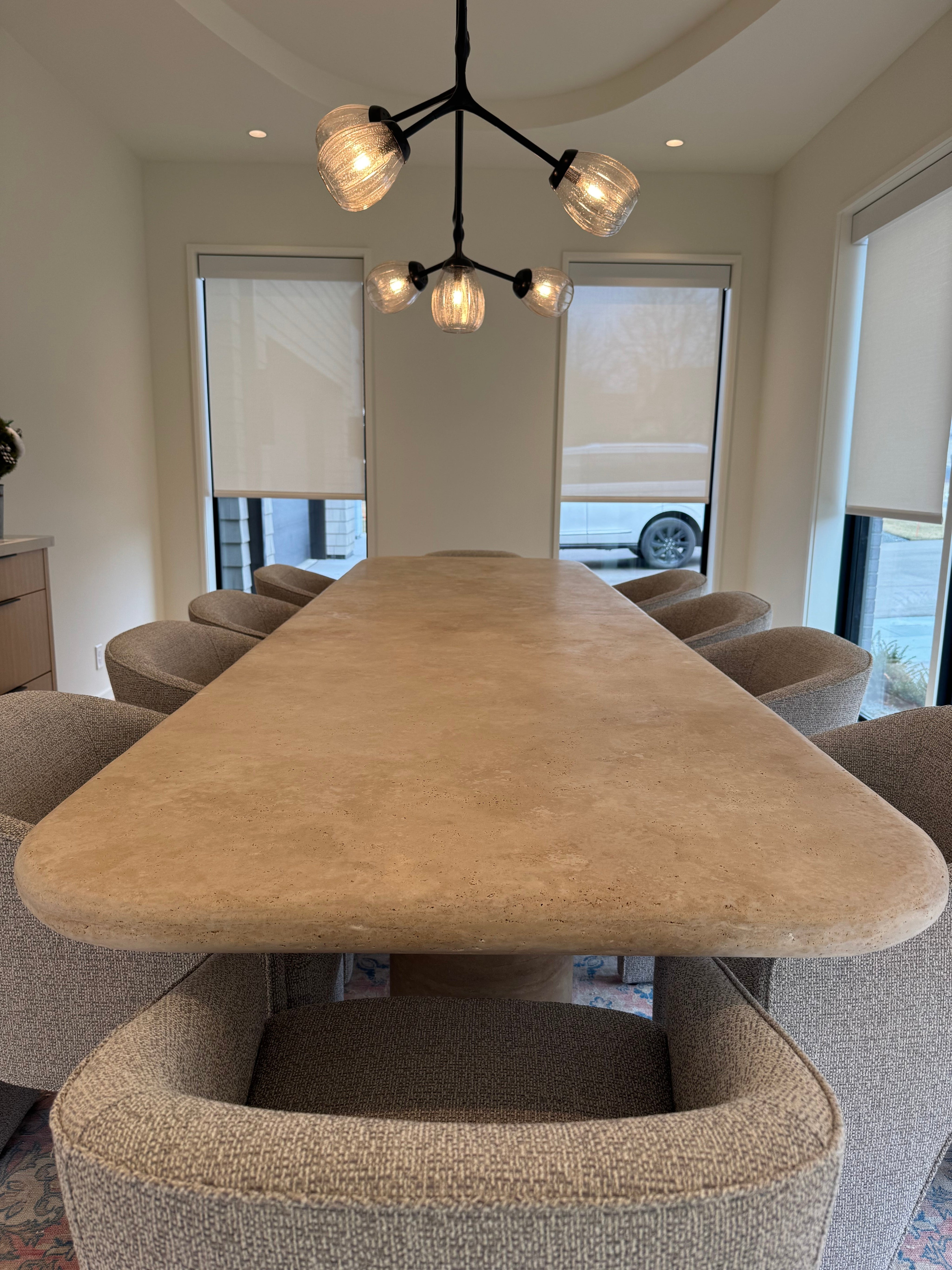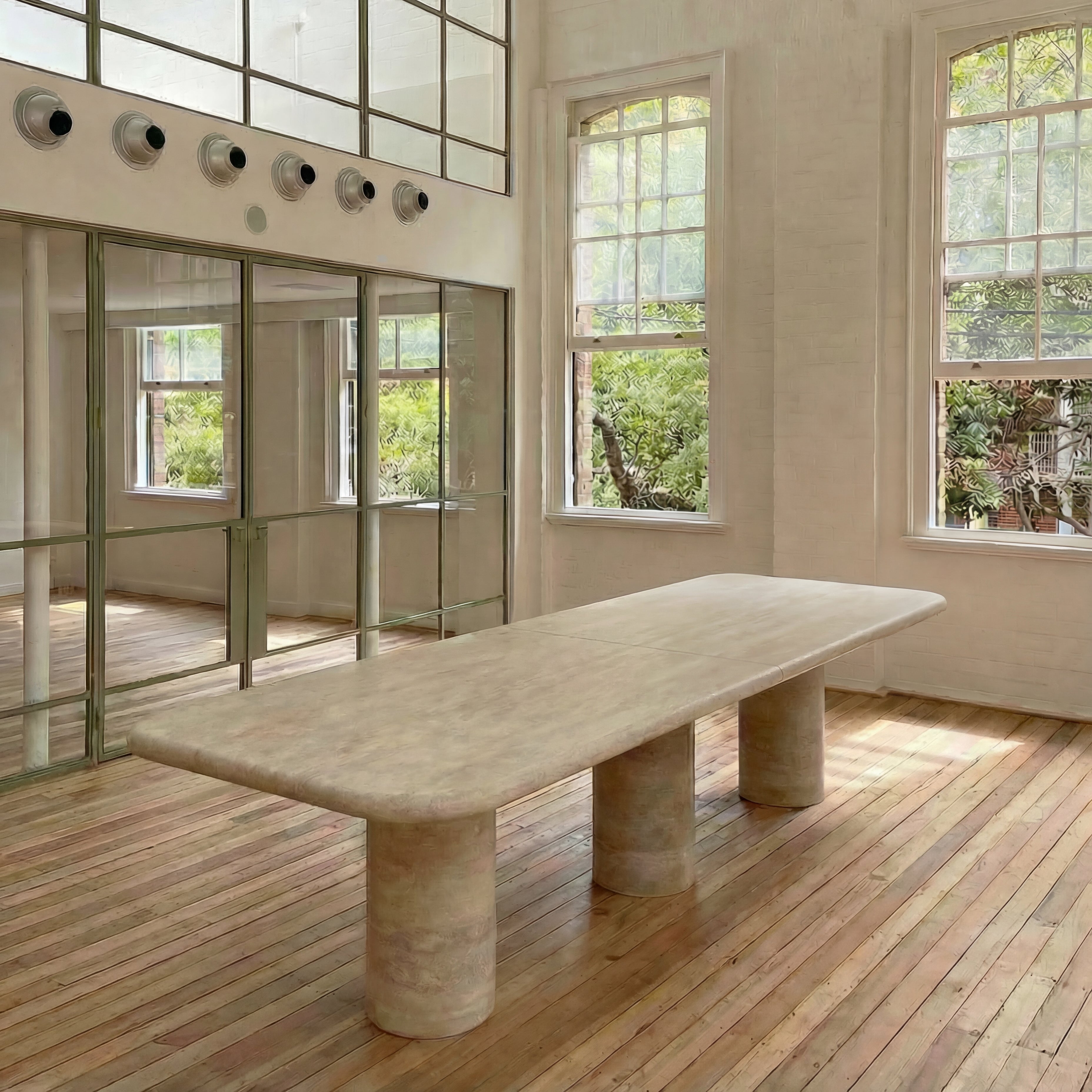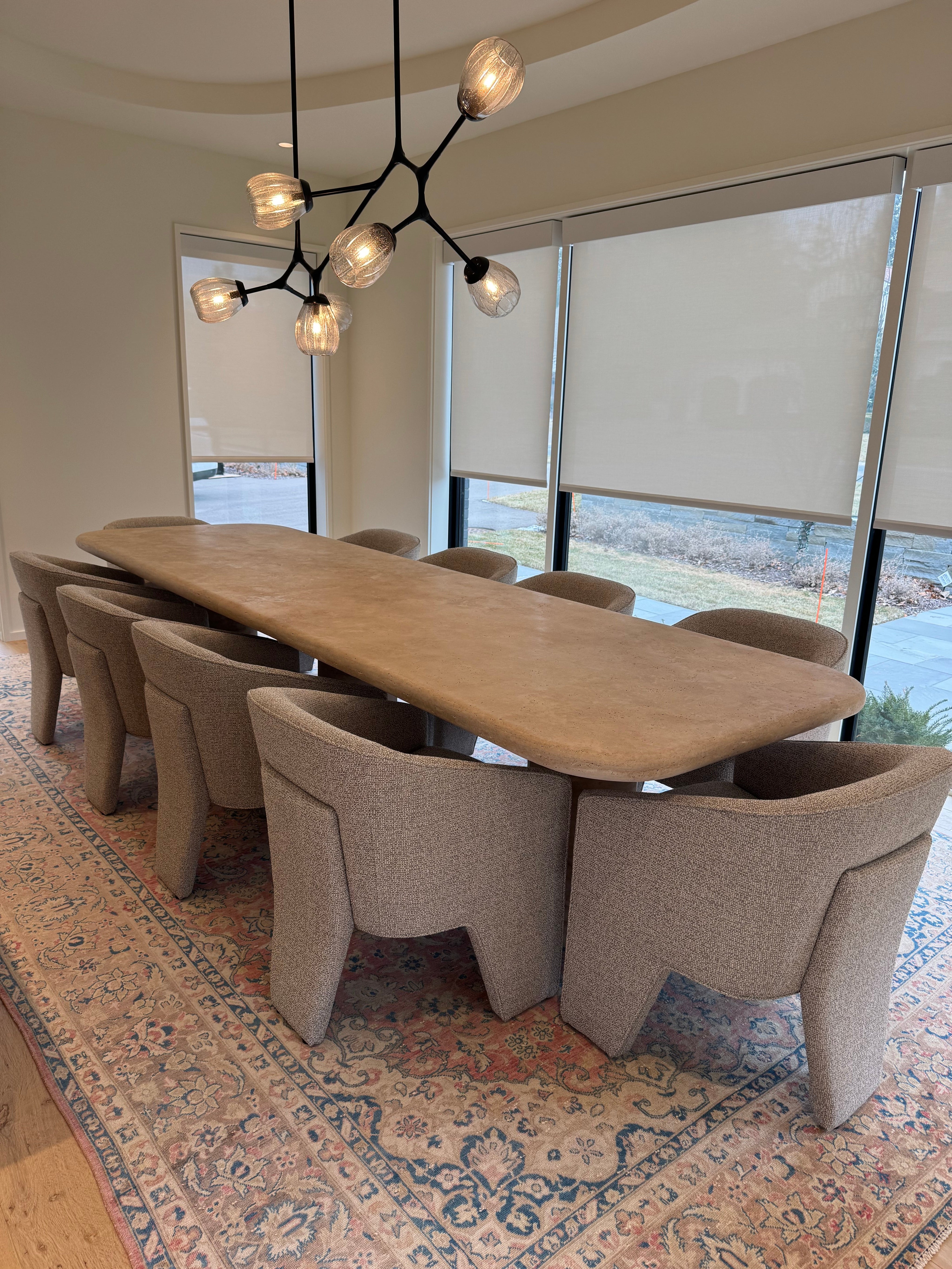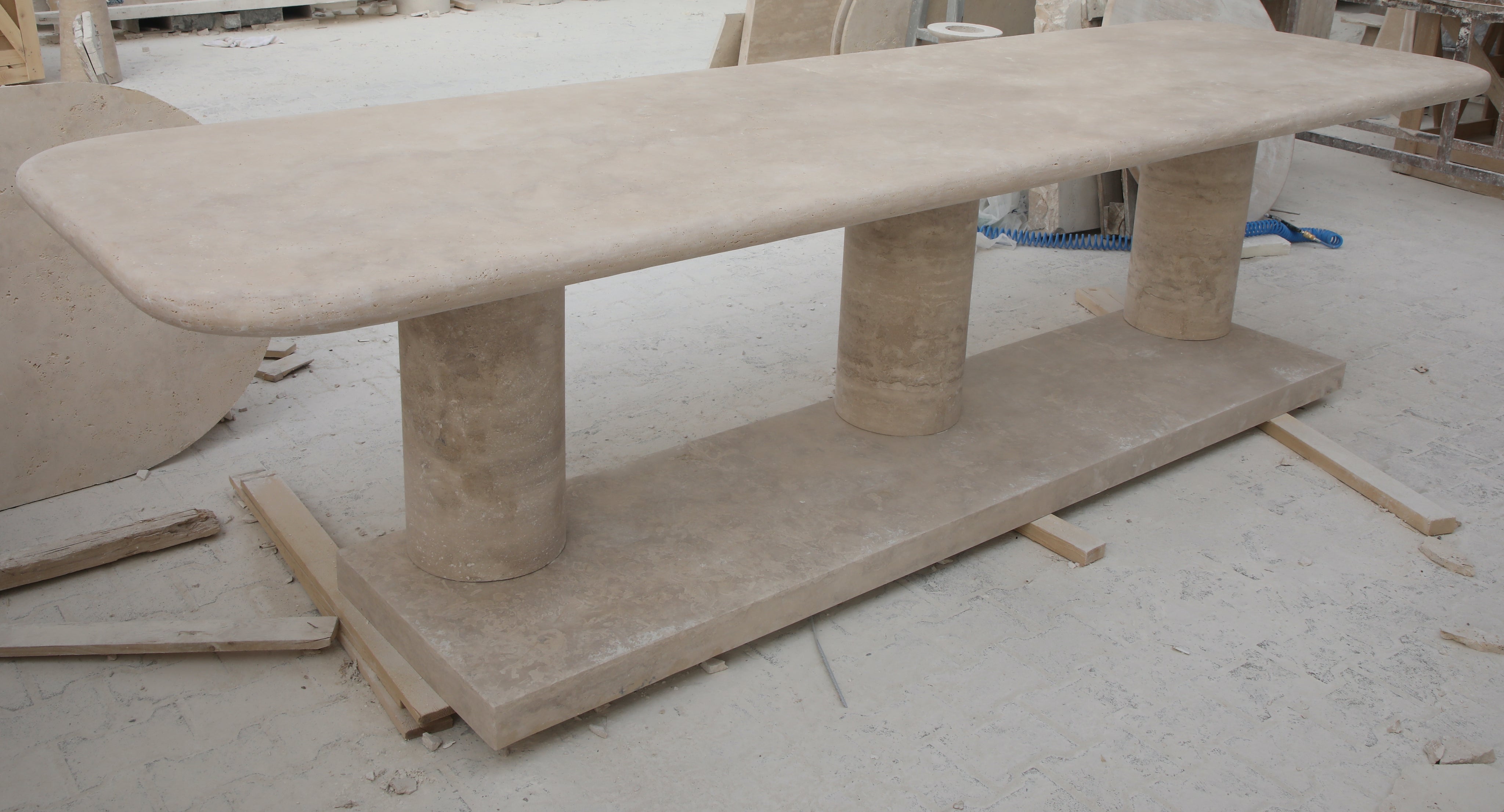 The Drift Dining Table is a functional work of art, crafted from travertine with a substantial 6 cm thick two-piece top, featuring elegantly curved edges and supported by three cylindrical columns.