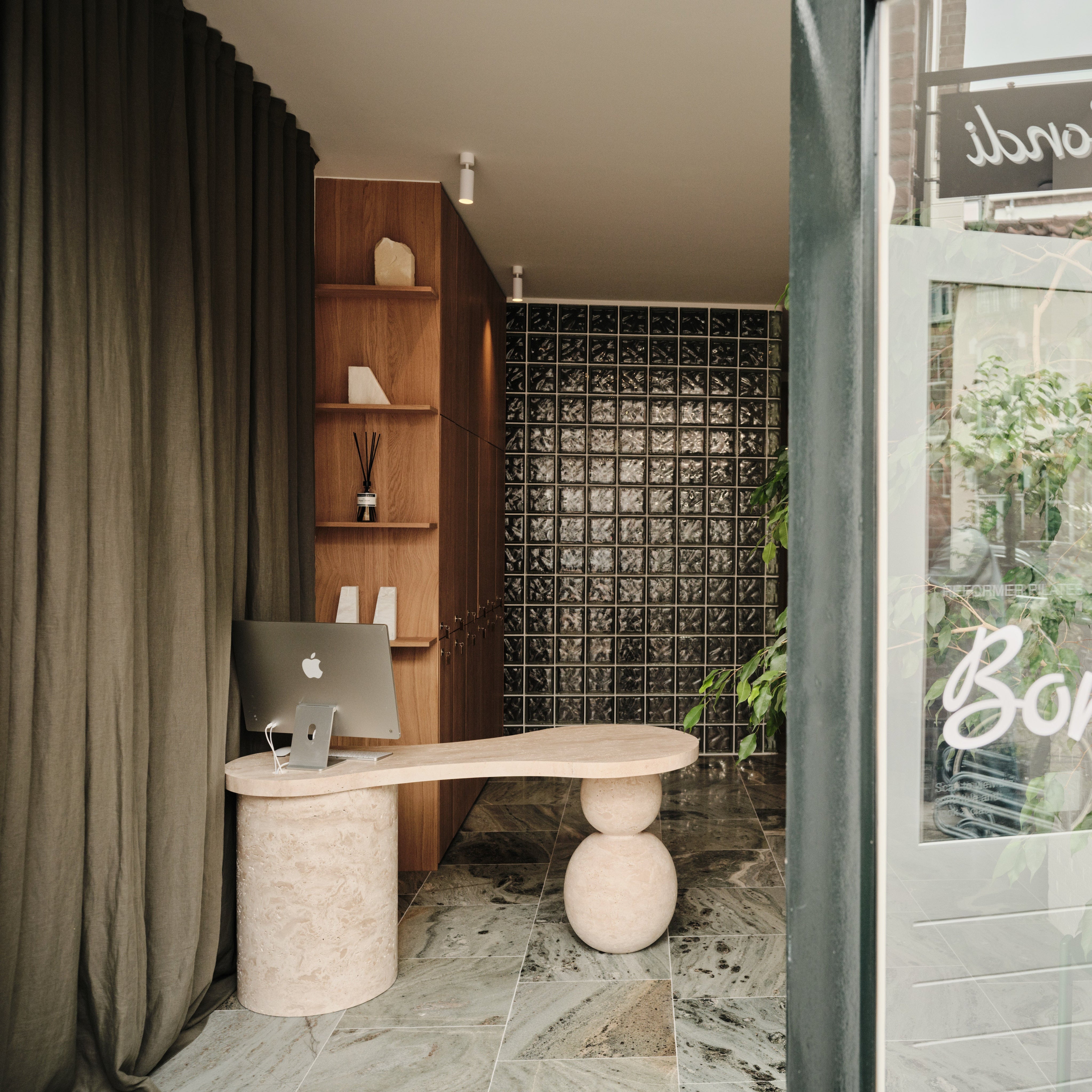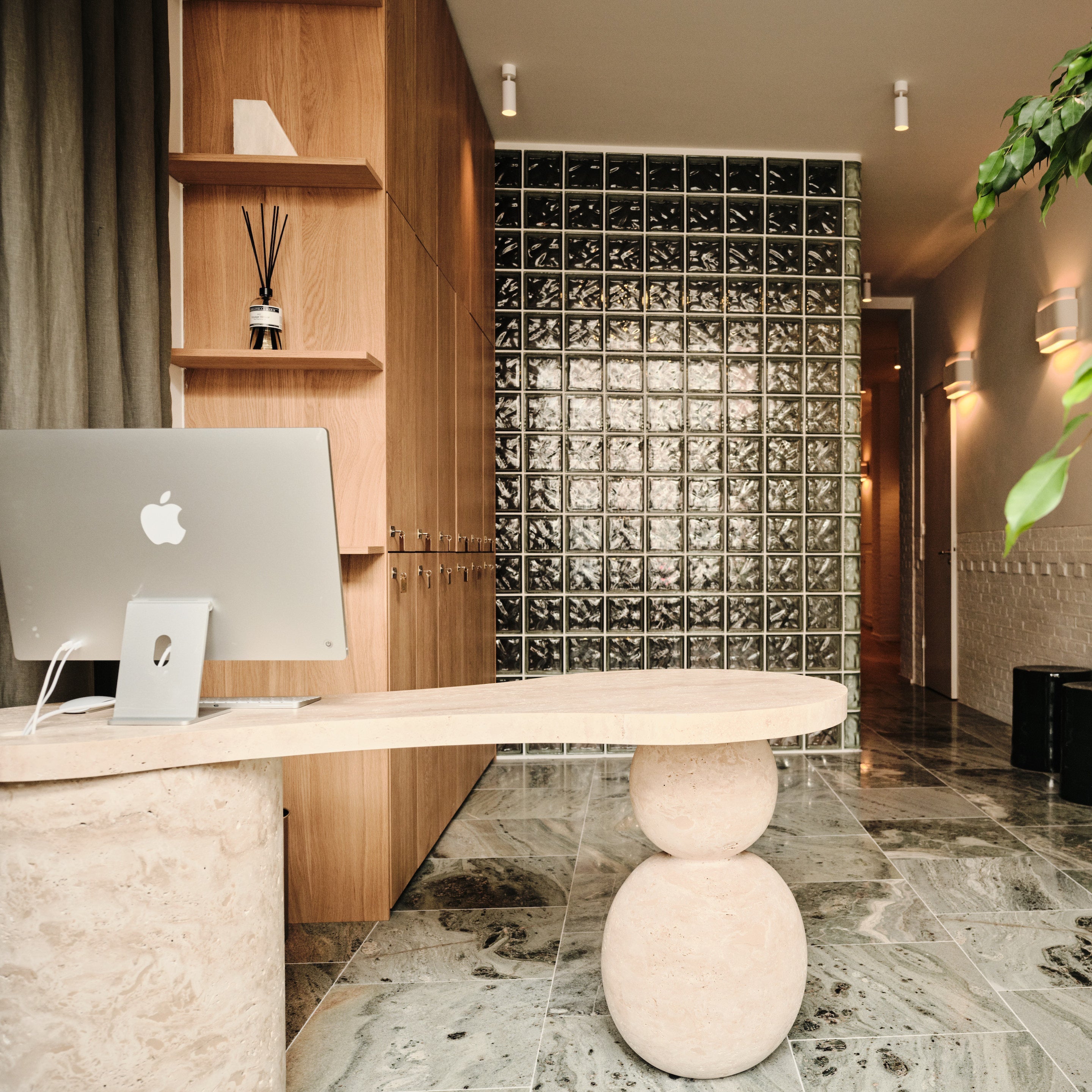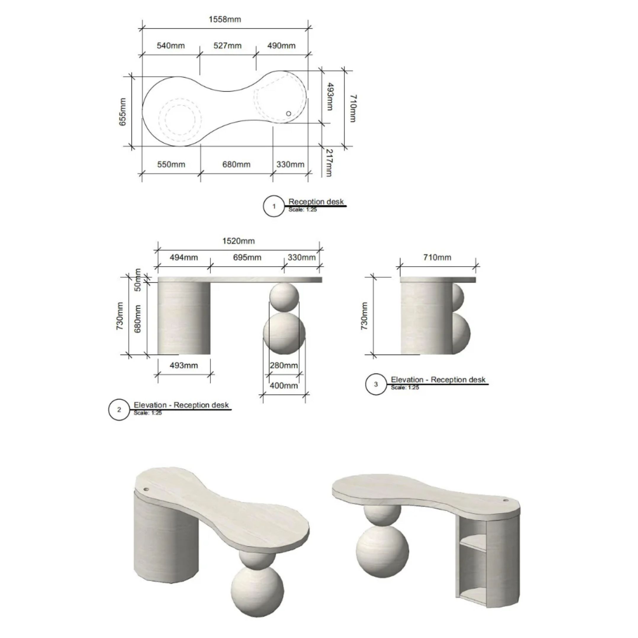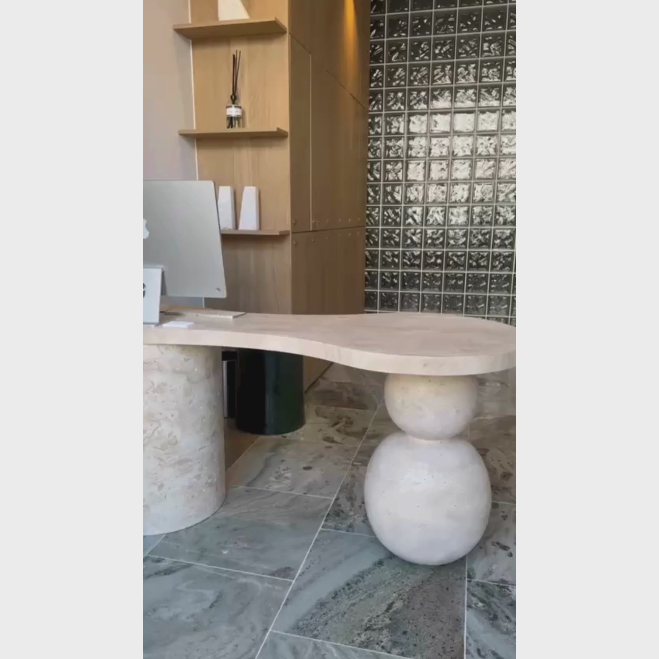 The organic shape of this minimalist desk is anchored by its stacked sphere-shaped legs that double as functional art. On the opposite end, a cylindrical column incorporates open shelving, ideal for discreet storage or display.