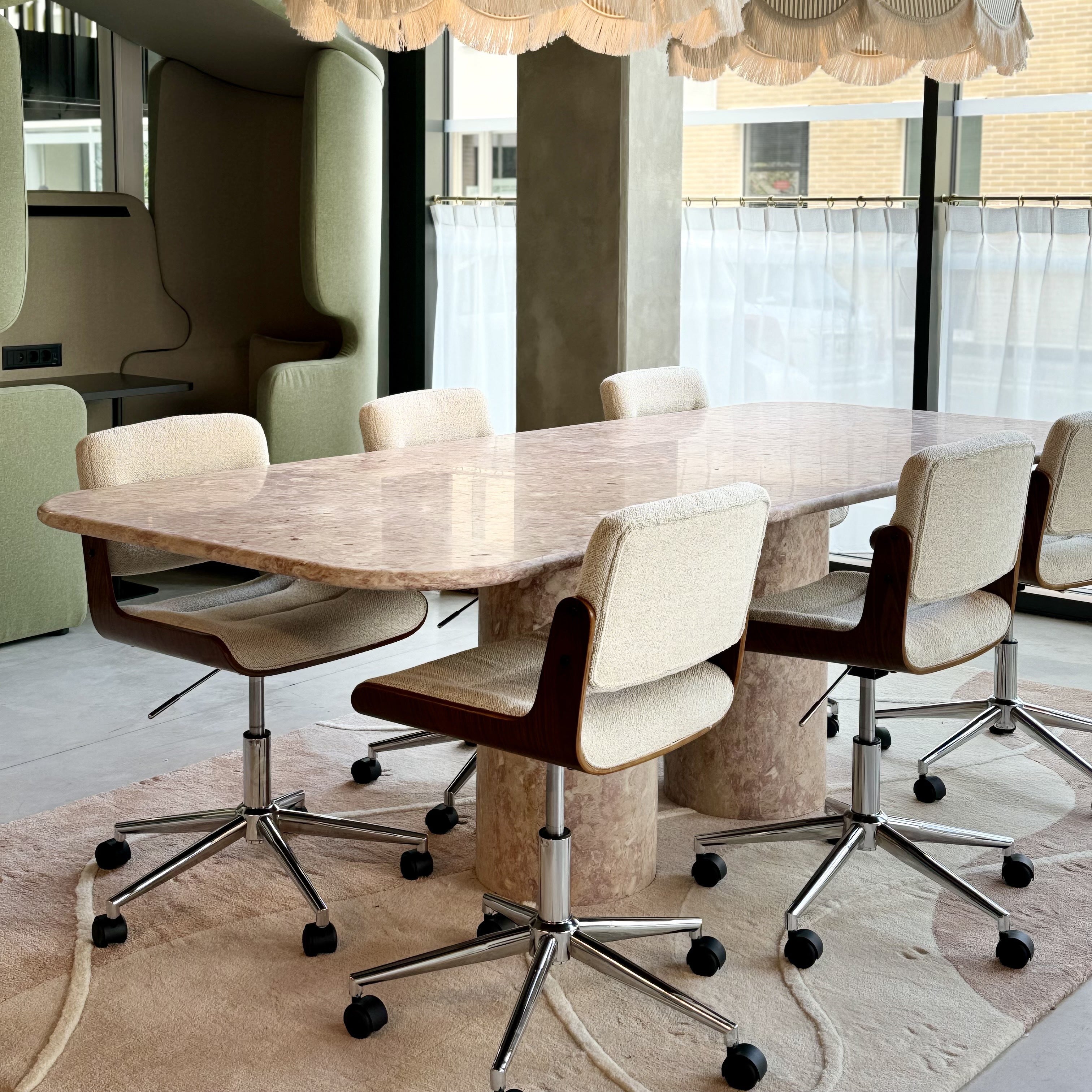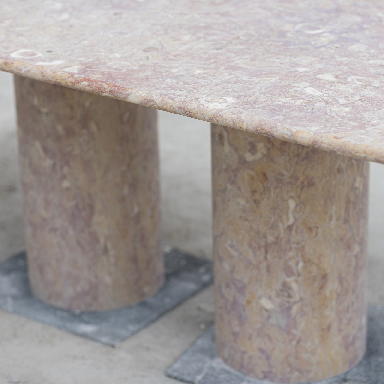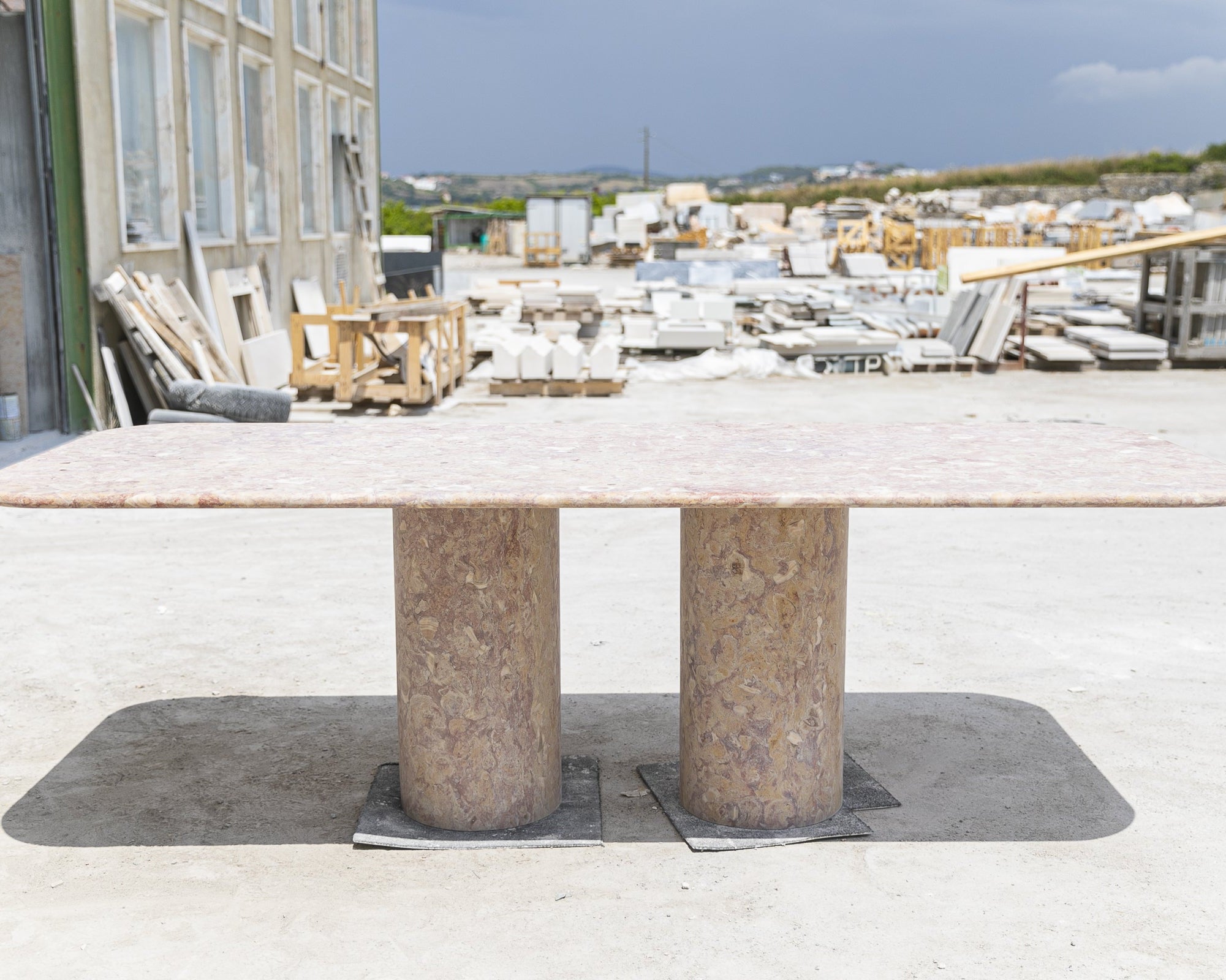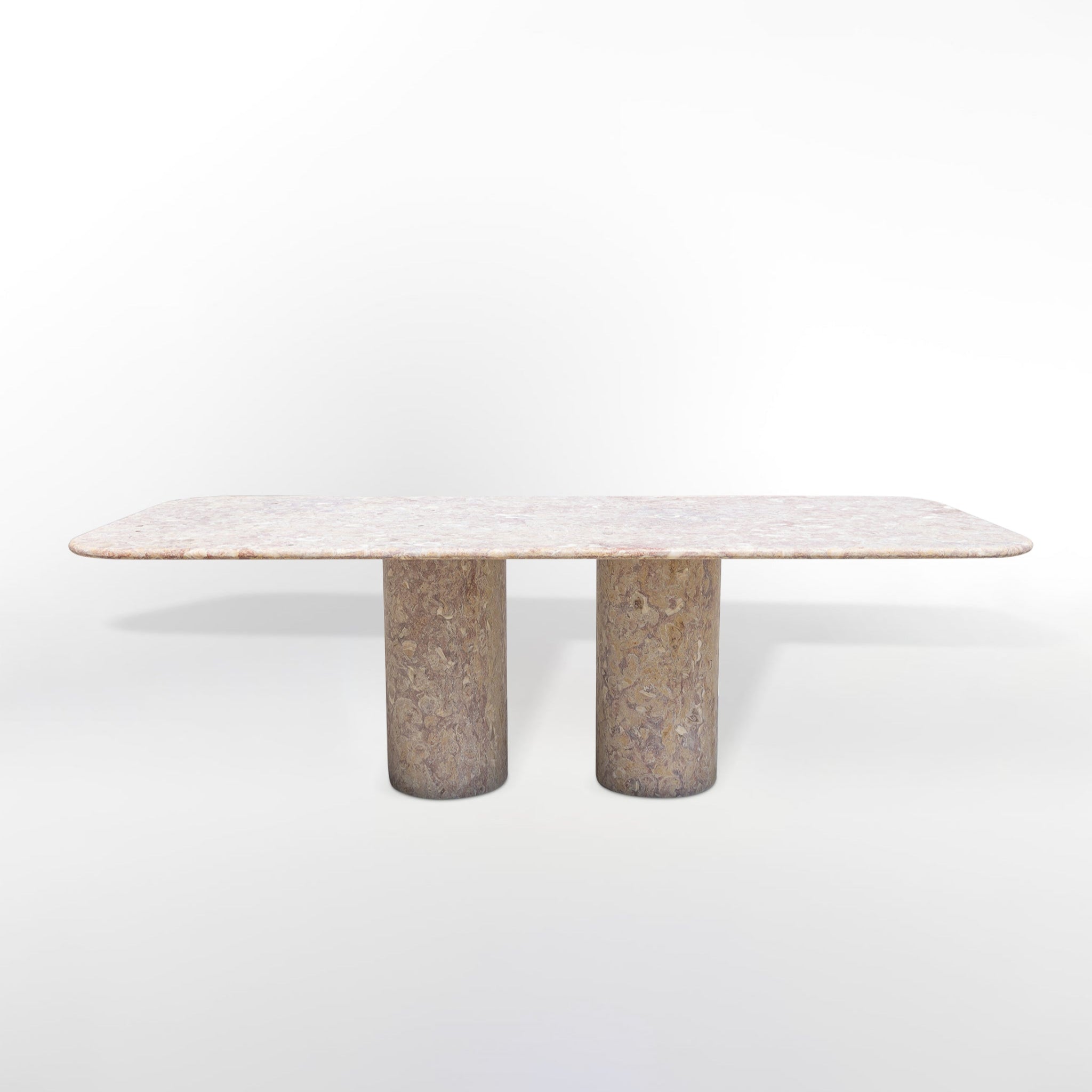 The Gio Dining Table is crafted from a single stone, featuring a 3 cm thick bullnose-edge top set on two generous column legs. Designed to comfortably seat eight.