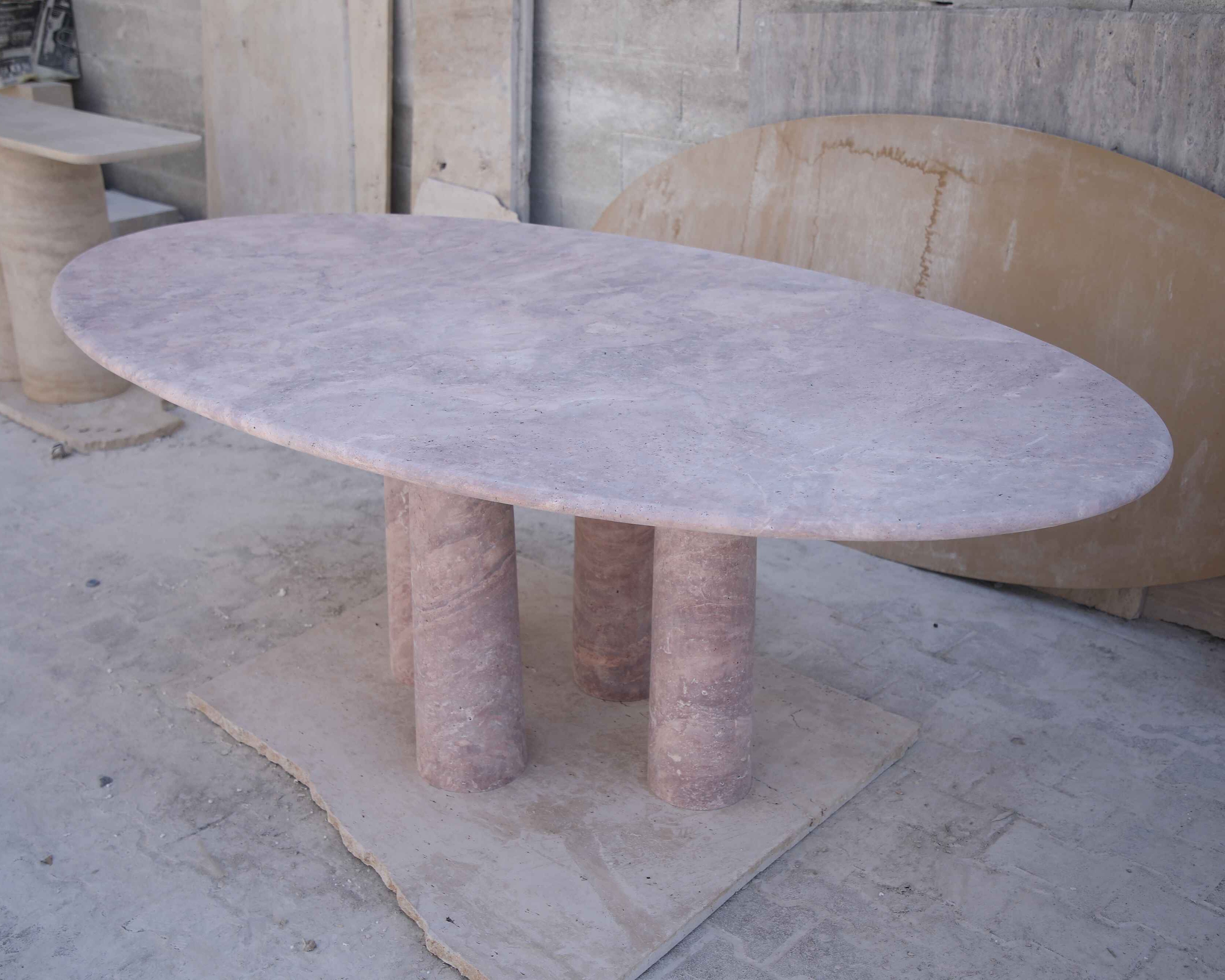 The table is pictured in Red Travertine, a stone that changes in appearance depending on how its finished—its colour becomes more vibrant with a polished (shiny) finish, while a honed finish gives it a softer, pinkish-red hue.