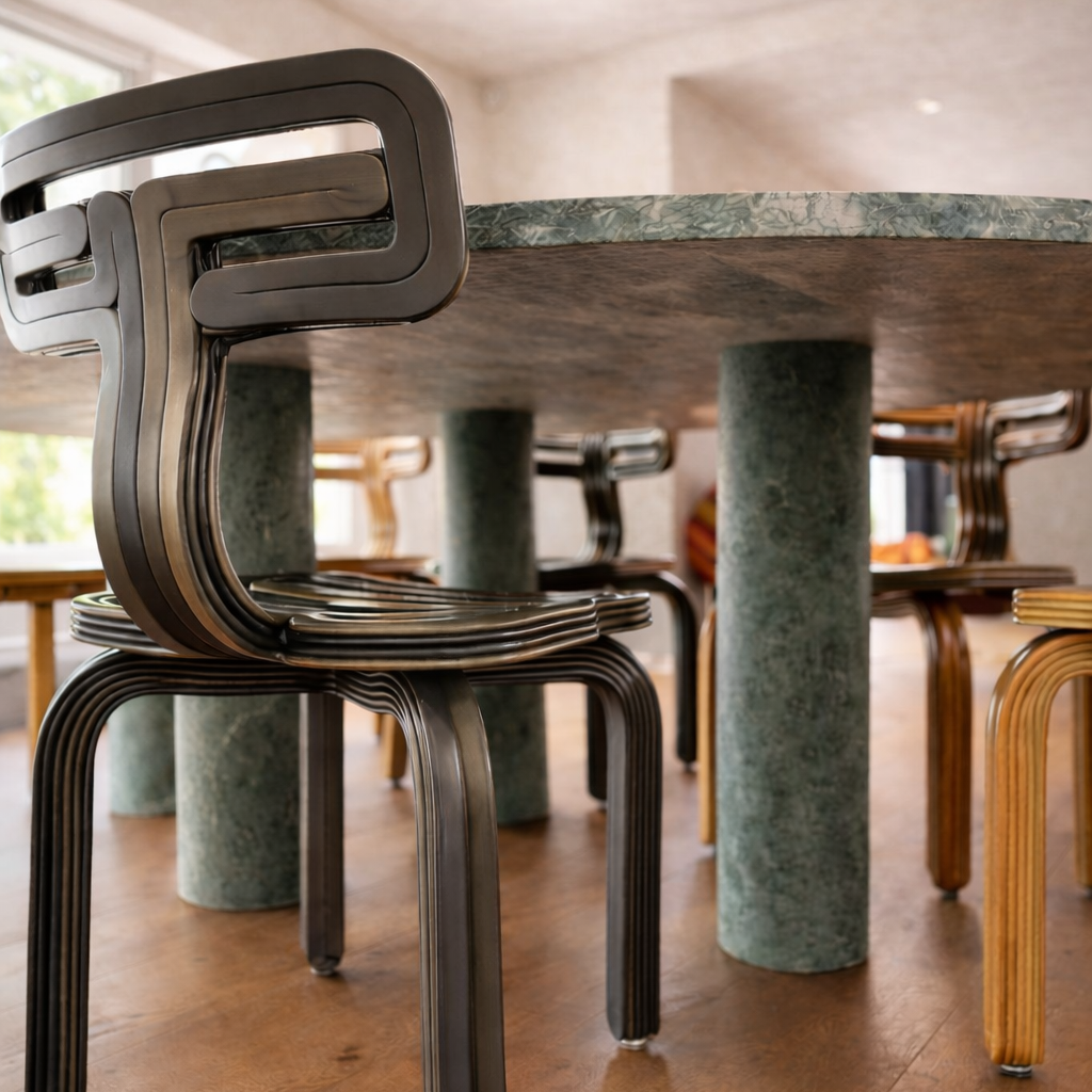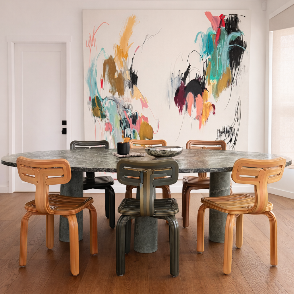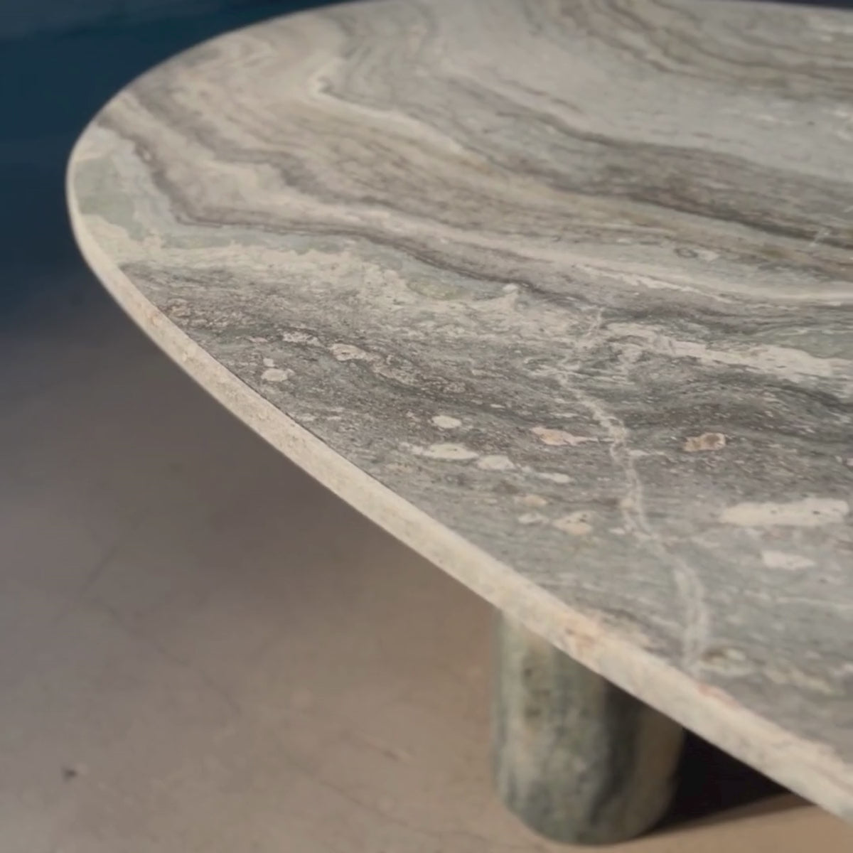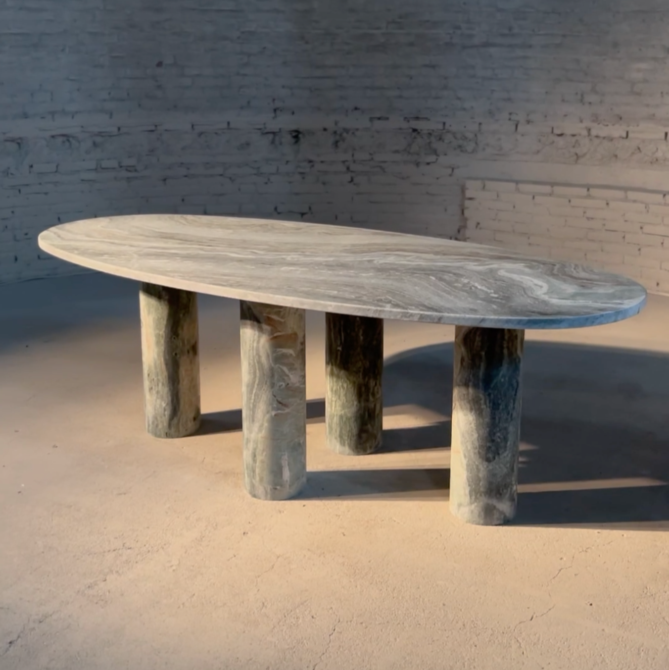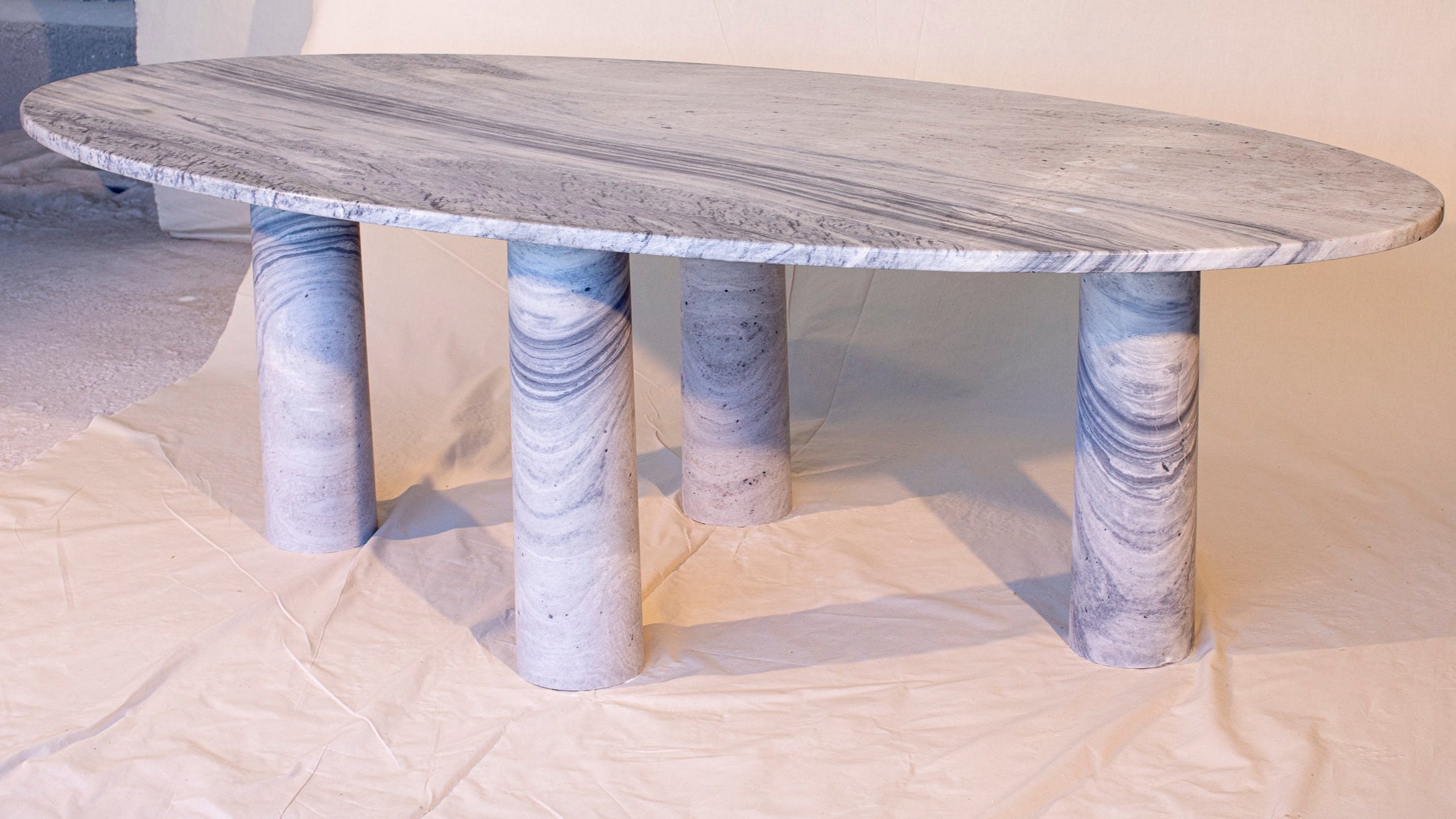Carved from a single block of stone, the Mario Oval Dining Table X-L features an oval top with a soft eased edge, supported by four gently tapered cylindrical legs. The X-L version includes thicker legs and distinct edge detailing compared to our standard Mario Oval Dining Table.