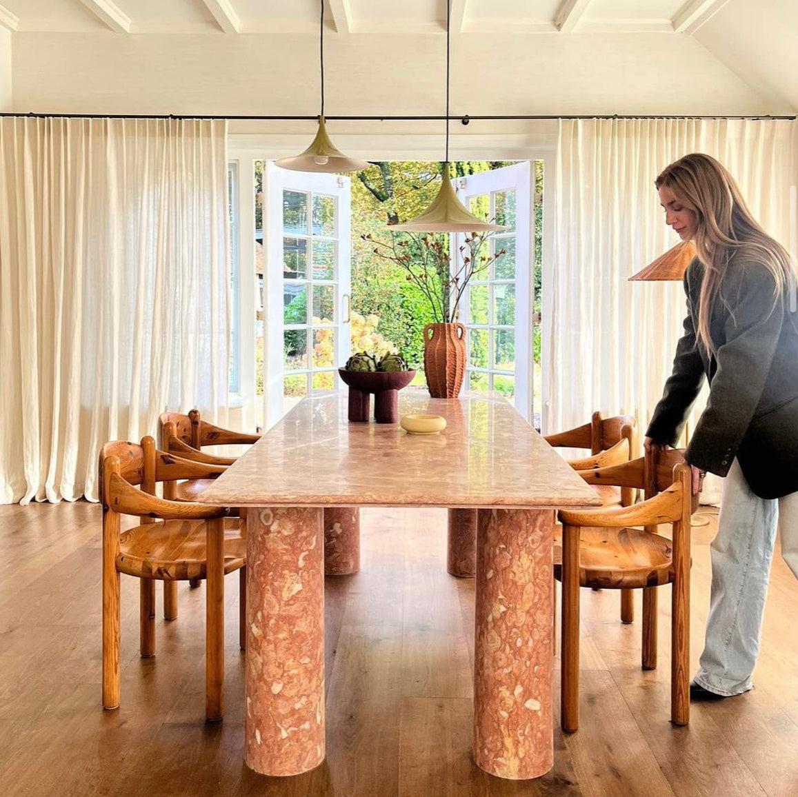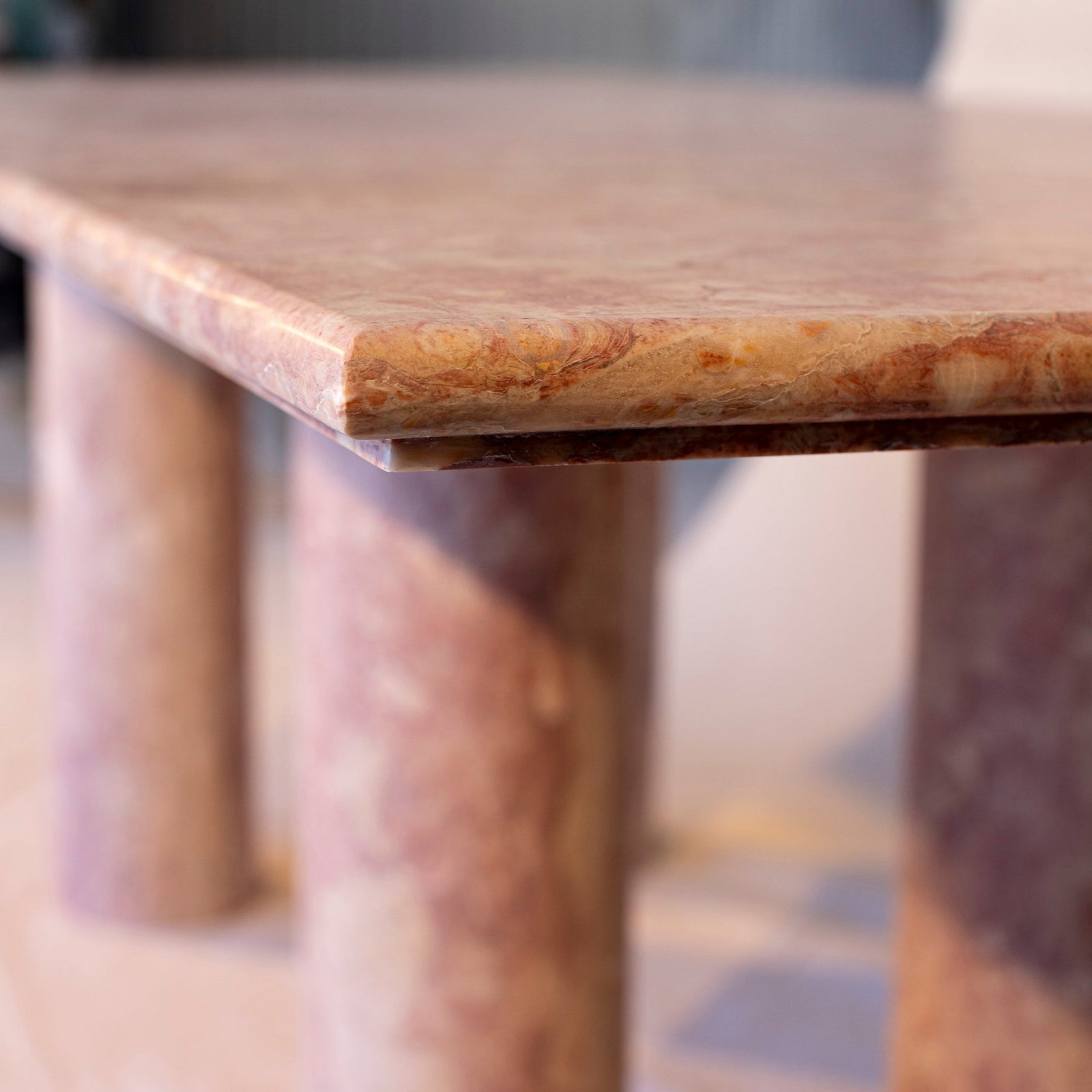Carved from a single block of stone, the Mario Rectangle Dining Table X-L features a rectangular top with a reverse waterfall edge (2 cm + 1 cm), supported by four gently tapered cylindrical legs. The X-L version includes thicker legs and distinct edge detailing compared to our standard Mario Rectangle Dining Table.