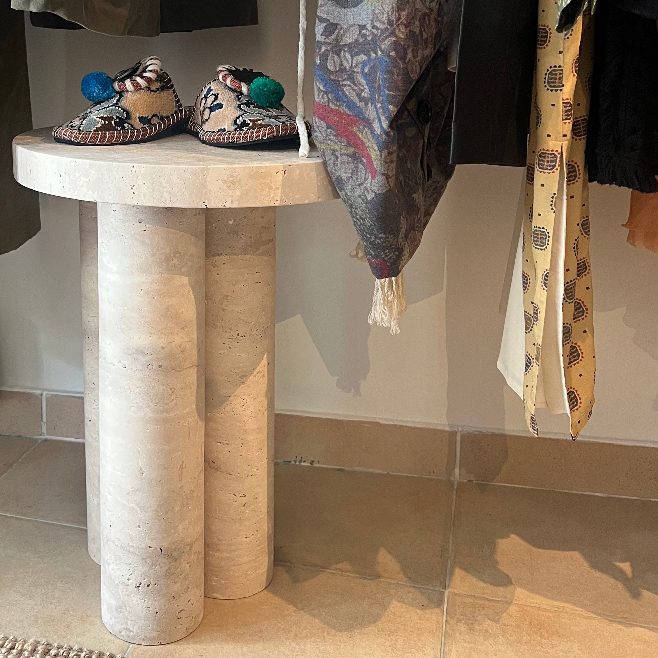 Composed entirely of natural stone, the Mario Side Table features a 4 cm thick circular top supported by three solid cylindrical legs.